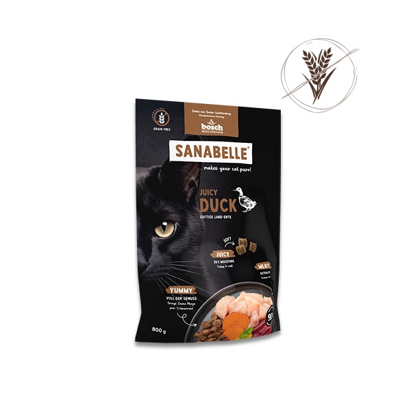 Manche Katzen wissen genau, was sie wollen. Und das ist auch gut so denn Sanabelle Juicy Ente wurde für echte Genießer entwickelt: Mit frischer Land-Ente und feinem Hühnchen bringt diese Sorte einen besonders intensiven, herzhaften Geschmack in den Napf für anspruchsvolle Katzen, die sich nicht mit weniger zufriedengeben.